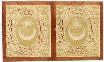 Türkiye: 1868 (28 October). Dulos postage due type inscription and border in red-brown 25pi mint o.g. imperforate pair. Sg. D71A, Isfila 56ES09. *