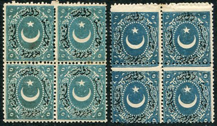 Ottoman Empire: 1868 (28 October). Dulos type 5pi perf. 13 1/2 indigo-blue and greenish blue mint o.g. blocks of four. Isfila 50, Sg. 39a, 39b