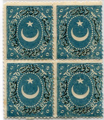 Ottoman Empire: 1868 (28 October). Dulos type 5pi greenish blue without rays around star mint o.g. block of four. Sg. 39a, Isfila 50BE119[RV2]. *