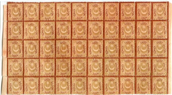 Ottoman Empire: 1868 (28 October). Dulos type III star & crescent postage due issue 5pi inscription and border in red-brown perf. 13 1/4 unmounted mint pane of 50. Scarce multiple. Isfila 55, Mi. 14Aa Sg. D70A. **