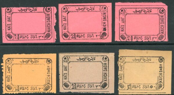 Türkiye: 1868 Public Wells or Fountains Tax five 20pa. and 50pa. KAICH – DAGH (Kayışdağı) imprinted in four languages (Turkish, Armenian, Georgian, Greek) mint o.g. Suleymaniye 1811, 1817, 1818, 1841.*