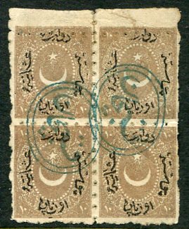 Bulgaria – Ottoman Post Offices: 1869-71 Dulos type 10pa irregular perf. marginal block of four struck by superb triple oval KASBEÇAN (Kaspichan, vilayet Danube, BG #87, A&P type 1, R) handstamps in blue-green. Isfila 69