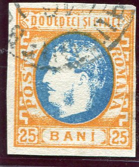 Romania: 1869 (1 April). Prince Carol I design imperf on white wove paper 25b blue and orange struck by part datestamp. ex. Danforth Walker. Sg. 77b