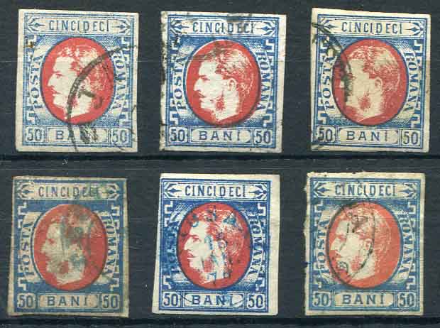 Romania: 1869 (1 April). Prince Carol six 50b different colour used stamps. Sg 78+