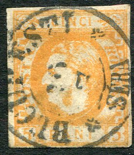 Romania: 1869 (1 April). Prince Carol 5b orange struck by superb BUCURESTI * SERA 16/7 datestamp. Sg. 74