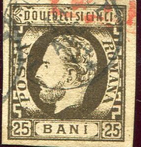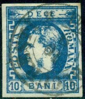 Romania: 1869 (1 April). Prince Carol new currency white wove paper imperforate 10b dull blue, very fine used. SG 75