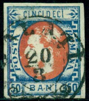 Romania: 1869 (1 April). Prince Carol new currency white wove paper imperforate 50b red and pale blue, very fine used. SG 78