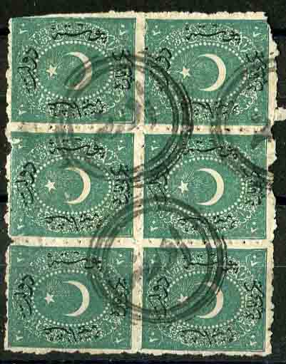 Ottoman Turkey: circa 1869-71 block of six 10pa Dulos stamps struck by EDIRNE (A&P type 6) triple circle handstamps.
