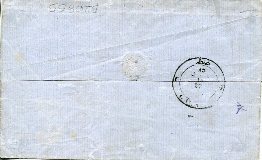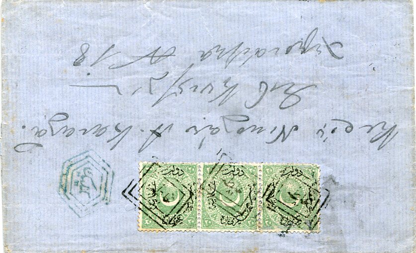 Ottoman Turkey: 1869 entire to Istanbul struck by triple hexagonal GEMLIK 81 (vilayet Hüdavendigar, A&P type 2, RR) handstamps and franked on arrival with strip of three 20pa of 1868 Dulos stamps for 1 1/2pi single weight up to 100 route-hours rate tied by Galata 81 triple box handstamps and on reverse Galata arrival cds.