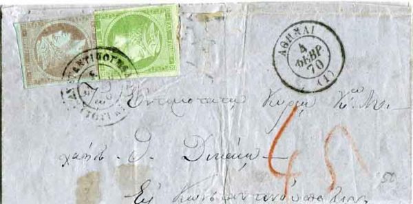 Türkiye – Greek Post Offices: 1870 folded entire to Piraeus franked with 5l and 40l large Hermes heads tied by Constantinople datestamp, 4 February Athens transit and on reverse same day arrival cds’s.