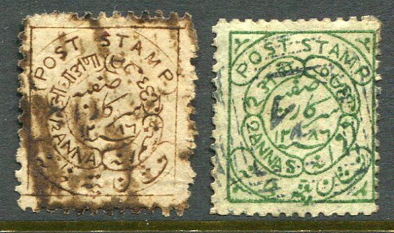 Indian Feudatory States – Hyderabad: 1870 (16 March). Locally engraved 1/2a and 2a used set. Sg. 2/3