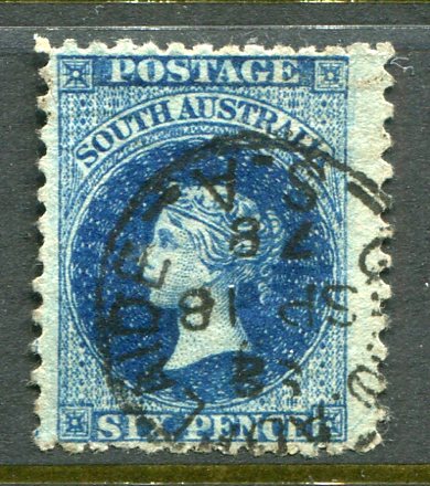 South Australia: 1870 (26 October). 6d. bright Prussian blue perf. 11 1/2 x 10 used. Sg. 106