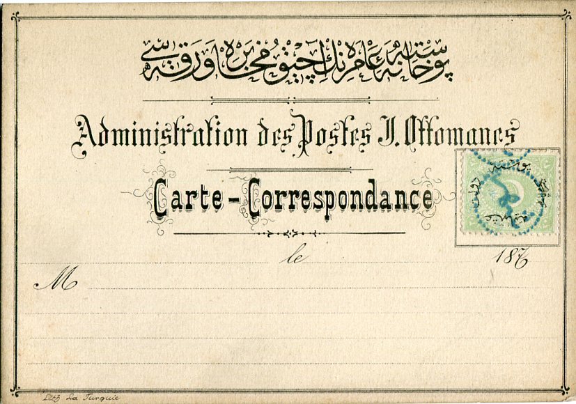 Turkey: 1870 unused formular card affixed with Sehir (City) overprinted on 20pa Dulos stamp. Couple of rust spots otherwise fine. Isfila F2B