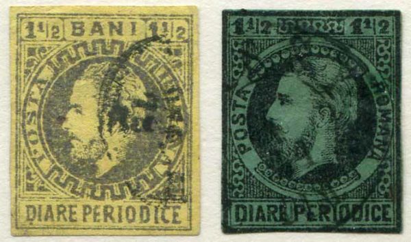 Romania: circa 1870 Prince Carol DIARE PERIODICE two 1 1/2b used newspaper tax stamps.