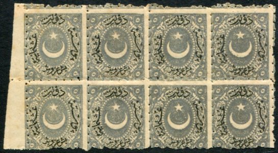 Türkiye: 1869-71 Dulos type irregular perf. 5pi slate grey mint o.g. block of eight. Probably the largest mint multiple recorded. Isfila 72, Sg. 45 *