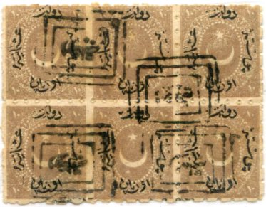 Türkiye: 1869-71 issue Dulos type irregular perf. 10pa yellow-brown block of six with vertically imperforate between (on left pair) error struck by triple box Deraliyye 81 hand stamps. Specialized catalogue only records horizontal pairs. The largest multiple recorded. Isfila 69