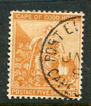 Cape of Good Hope: 1871 (25 August). Wmk. Crown CC 5s. yellow-orange perf. 14 fine used. Sg. 31