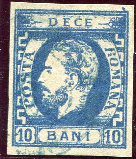 Romania: 1871 (December). Prince Carol I with beard design imperf on white wove paper 10b blue struck by part datestamp. Plate flaw on top right. ex. Danforth Walker. Sg. 85