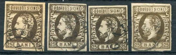 Romania: 1871 (December). Prince Carol with beard issue white wove paper four used 25b olive-brown with shades. Sg87