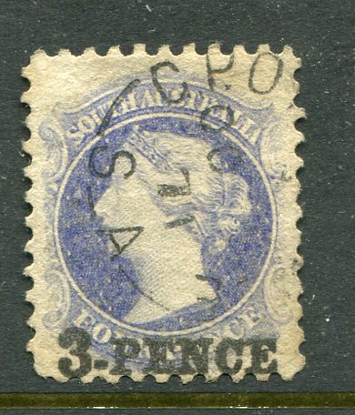 South Australia: 1871 (14 February). 3d. surcharged in black on 4d. dull ultramarine perf. 10 used. Sg. 92