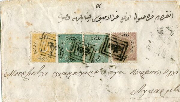 Ottoman Turkey: circa 1871 cover to Ankara franked with 10pa perf. 13 1/2 of 1868, pair of 20pa and 1pi of 1869-71 irregular perf. Dulos stamps for 2pi10pa double weight up to 100 route hours rate (distance was 87 hours) tied by DERALIYYE 81 triple box handstamps. Cover flap missing but still scarce three colour franking double weight cover.