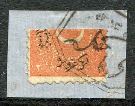 Ottoman Turkey: 1871 bisected Dulos type 2pi on piece with large part very fine YENIMAHALLE (vilayet Istanbul (Üsküdar), A&P type 1, RRR, #TR5773) handstamp.