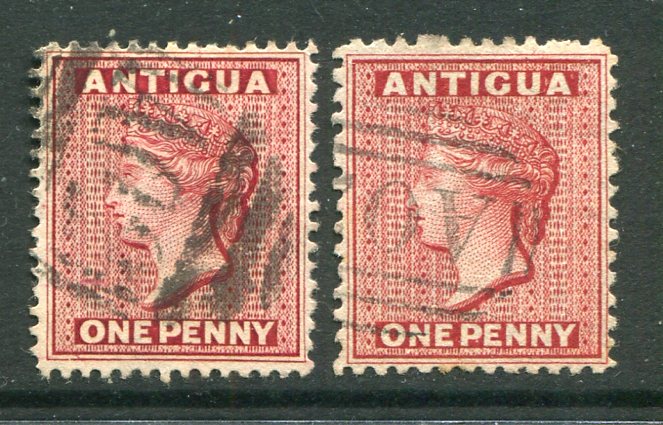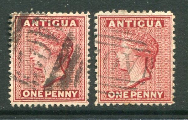 Antigua: 1872 wmk Crown CC 1d. lake and 1d. scarlet perf. 12 1/2 cancelled by AO2 hand stamps. Sg. 13, 14