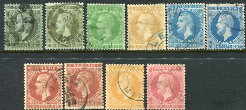 Romania: 1872 (15 October). Prince Carol tinted paper perf. 14 x 13 1/2 used set including additional colour varieties of 1 1/2b, 10b and 15b. Mi. 36/42, Sg. 104/111
