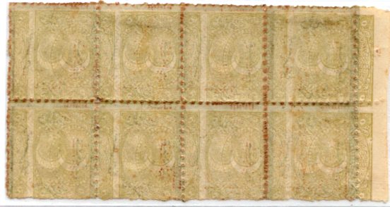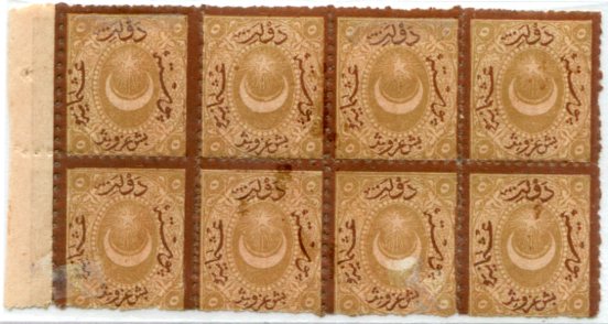 Türkiye: 1872 (May). Dulos type 5pi irregular perf. inscription and border grey-brown unmounted mint block of eight with printed both sides double, no overprint at back variety. Isfila 77BE 055/061 (types), Sg. D75Bb. *