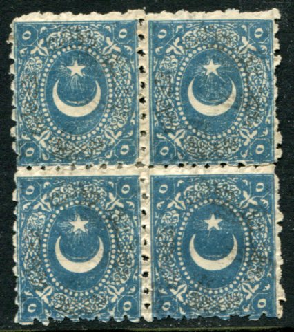 Ottoman Empire: 1872 (December). Dulos type 5pi blue irregular perf. mint o.g. overprint on both sides block of four. Isfila 80SE12, Sg. 47b. *