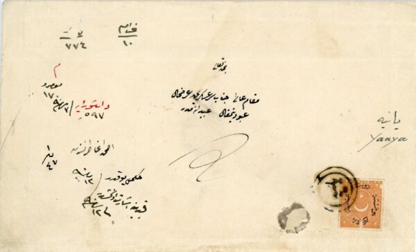Ottoman Post Offices in Greece: 1873 cover to Istanbul franked with 2pi. of 1871 Dulos stamps tied by double circle YANYA 81 (vilayet Janina, A&P type 3, GR #645, RR) handstamp. Reverse 29 May Stamboul arrival cds’s.