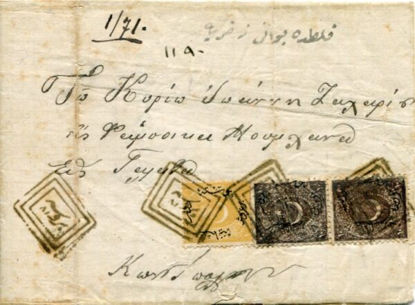 Ottoman Turkey: 1873 (25 August). Complete entire to Istanbul franked with 1pi perf. 13 ½ of 1868 and a pair of 10pa deep purple perf. 13 of 1873 Dulos stamps for 1 ½pi single weight up to 100 route hours rate tied by triple box BRUSA 81 handstamps. Reverse same day arrival cds’s. Lower pair of the 10pa has Arabic ∧. (80) instead of Ι. (10) on top right variety. Believed to be only recorded 10pa of this issue with variety on document. Isfila 48, 81 BE001 [RV2] – Sg. 37, 49