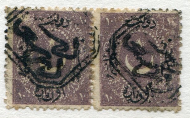 Türkiye: 1873 (April). Dulos type pair of 10pa purple perf. 12 1/2 struck by Dersaadet handstamps. Very scarce overprint Sg. type B at the bottom variety. Isfila 81, Sg. 49 (B)
