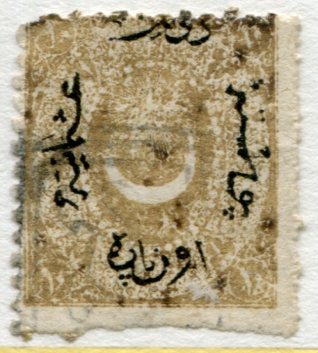 Ottoman Empire: 1873 (August). Dulos type 10pa bistre perf. 12 1/2 struck by illegible handstamp. Trimmed perfs. but scarce colour. Isfila 84, Sg. 55