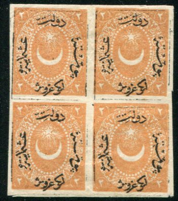 Türkiye: 1873 (April). Dulos type 2pi orange-brown mint o.g. imperforate block of four showing frame lines. Isfila 82ES19, Sg. 56. *