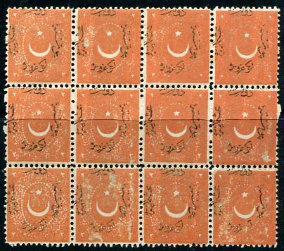 Ottoman Empire: 1873 (April). Dulos type 2pi red-brown perf. 12 1/2 unmounted mint block of twelve. Split on top strip. Isfila 82, Sg. 56