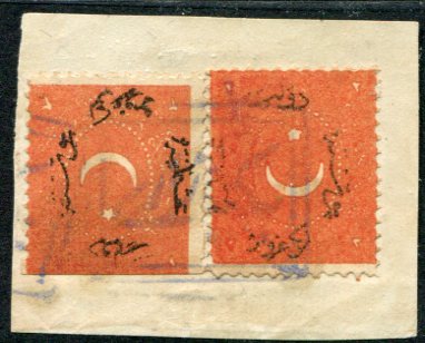 Ottoman Empire: 1873 (April). Dulos type two 2pi red-brown perf. 12 to 13 on piece, one with overprint partially erased variety struck by double box BEYPAZARI (vilayet Ankara, A&P type 1) handstamp. Isfila 82SE23[RV2], Sg. 56