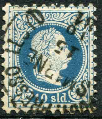 Austrian Levant: 1875 Lombardy and Venetia currency fine printing 10s. blue perf. 9 1/2 struck with SPED. POST. PRESSO LLOYD SMIRNE (Izmir, Turkey) 15.10.81 datestamp. Sg. 11