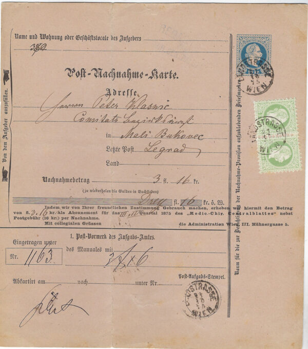 Austria: 1875 10Kr Post Nachnahme Karte stationery form for item to Mali-Bukovec, Croatia additionally franked pair Franz Joseph, fine whiskers, 3Kr. Green horizontal pair, tied by Landstrasse Wien cds, reverse with arrival cds and return arrival; vertical fold.