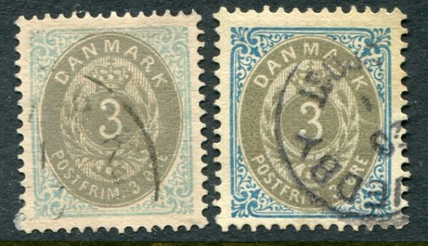 Denmark: 1875 (1 January). New currency 3ö grey and grey blue and grey and blue perf. 14 x 13 1/2 comb. used.