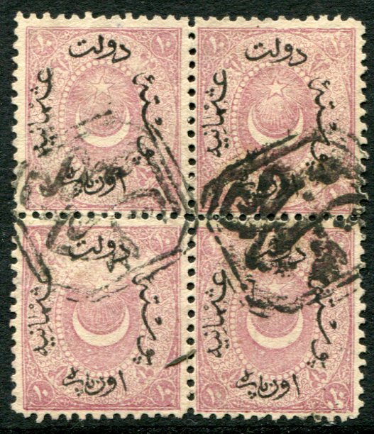 Ottoman Empire: 1875 (January). Dulos type 10pa mauve perf. 12 block of four with additional dots on lower right value tablet on fourth stamp variety struck by Dersaadet 3 (A&P type 15) handstamps. Isfila 87var, Sg. 59