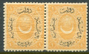 Türkiye: 1875 (August). Dulos type 1pi unmounted mint pair with small “ayn” in Osmaniyye script variety. Isfila 90, Sg. 63 (Plate C). **