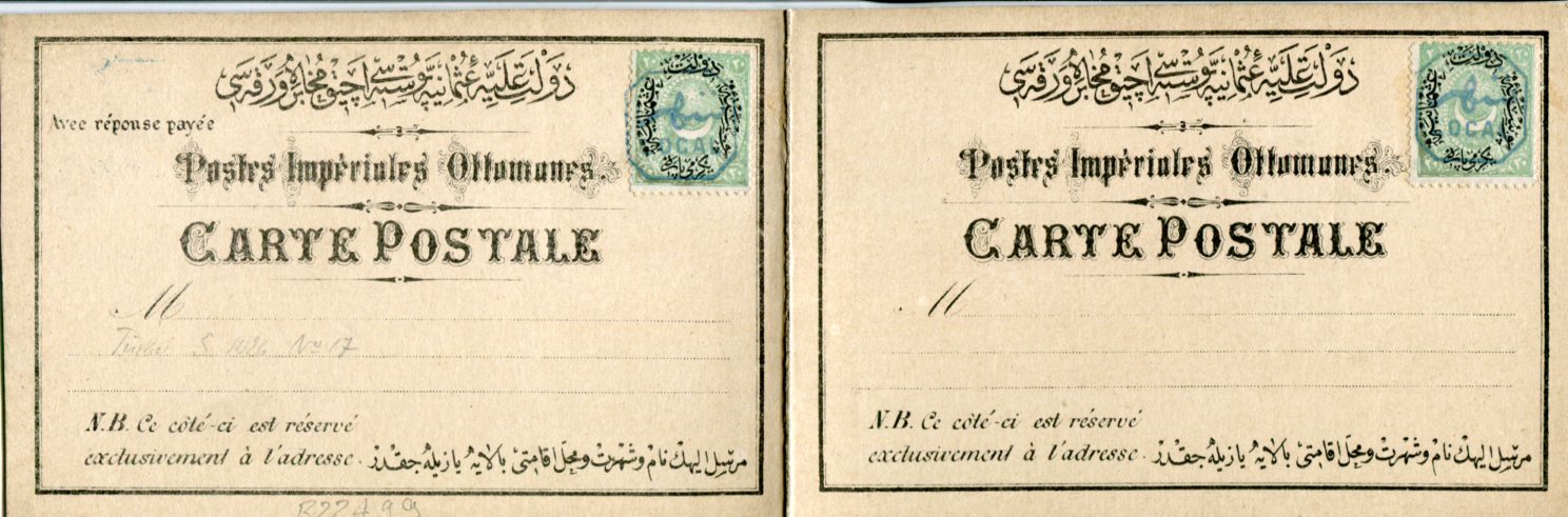 Turkey: 1875 unused reply formular card affixed with 20pa LOCAL overprinted Dulos stamps. Isfila F4A