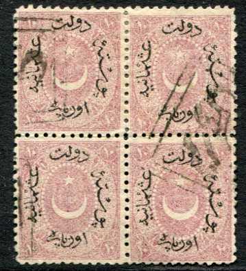 Turkey: 1875 (January). Dulos type star & crescent type IV overprint 10pa block of four struck by double box TARSUS (vilayet Adana, A&P type 1) handstamps. Isfila 87