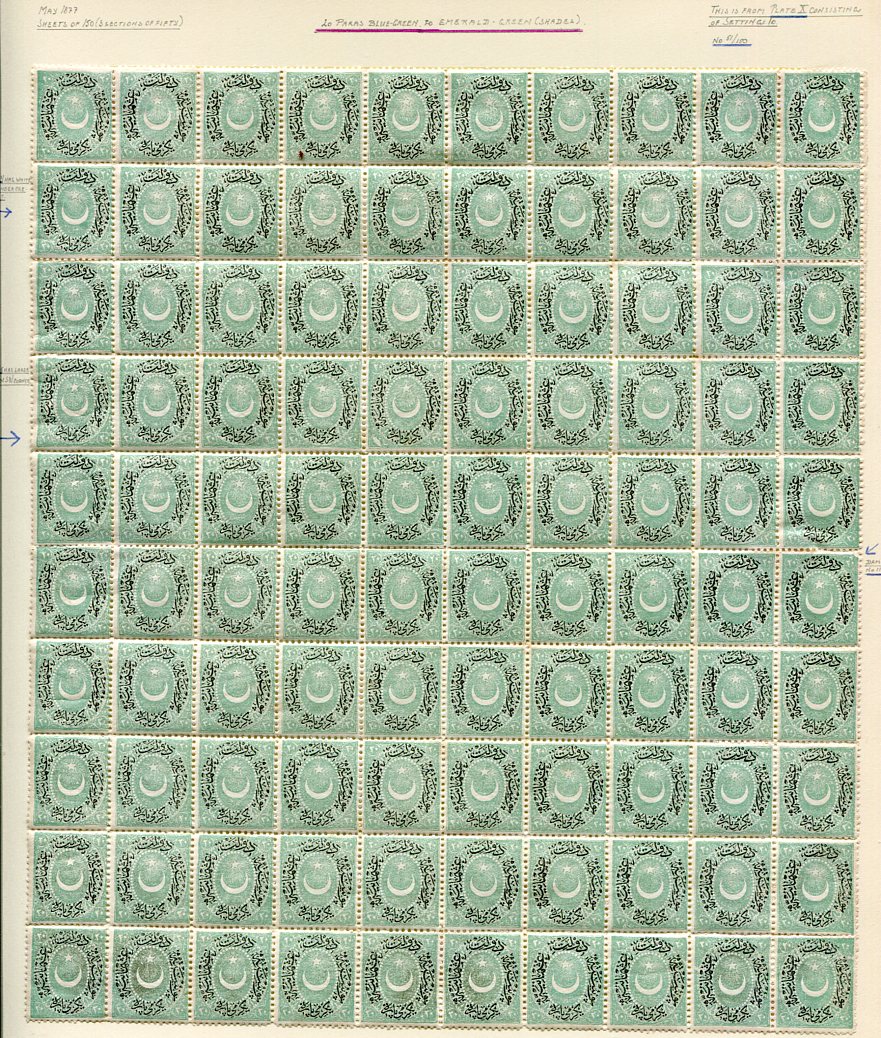 Ottoman Empire: 1877 (May). Dulos type 20pa mint o.g. block of 100 hinged on exhibition page with varieties noted by pencil. Described as plate X of setting 10. Isfila 100. *