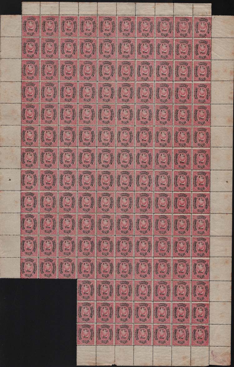 Ottoman Empire: 1876 (13 January). Dulos type V star & crescent issue overprinted 1 1/4pi on 50pa as per UPU regulations unmounted mint folded sheet of 96 missing only a block of four from the complete sheet. Scarce multiple. Isfila 93, Mi. 24, Sg. 79. **