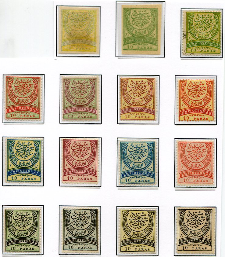 Ottoman Empire: 1876 UPU Empire 10pa colour proofs and essays collection of fifteen. One used, others unused. Isfila Specialised Ac4-Ac27 (between).
