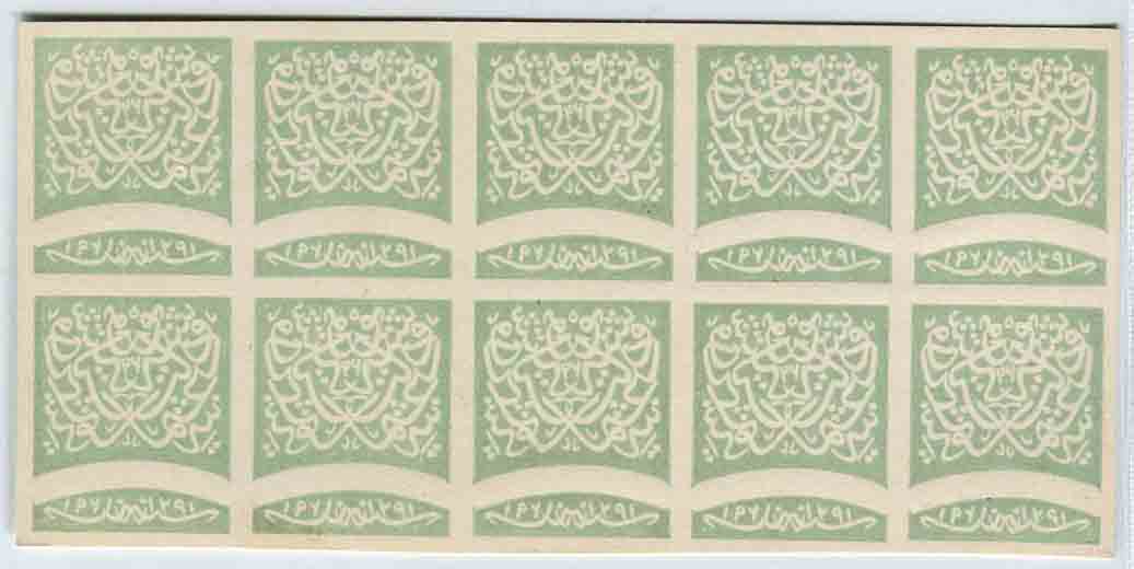 Türkiye: 1876 UPU Empire issue blue-green thick paper sheetlet of 10 background print essay. Isfila Ba16