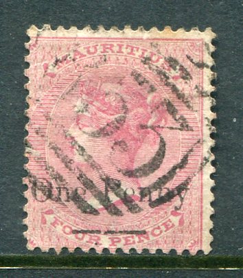 1877 Mauritius 1d on 4d Used Sg 80 quantity