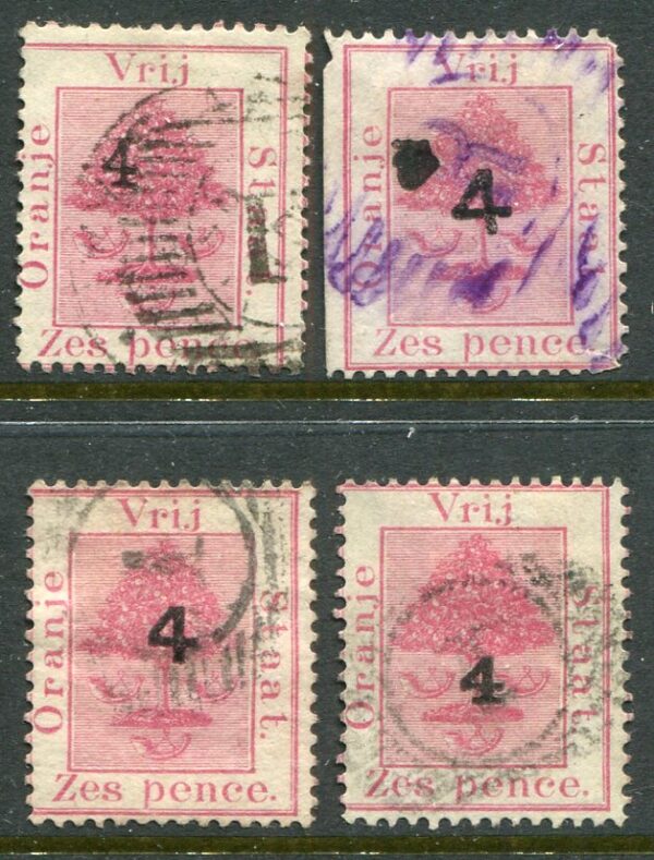 South Africa – Orange Free State: 1877.4d. surcharged on 6d. rose used set. Type (b) surcharged with left margin imperf. Scarce set. Sg. 10/13